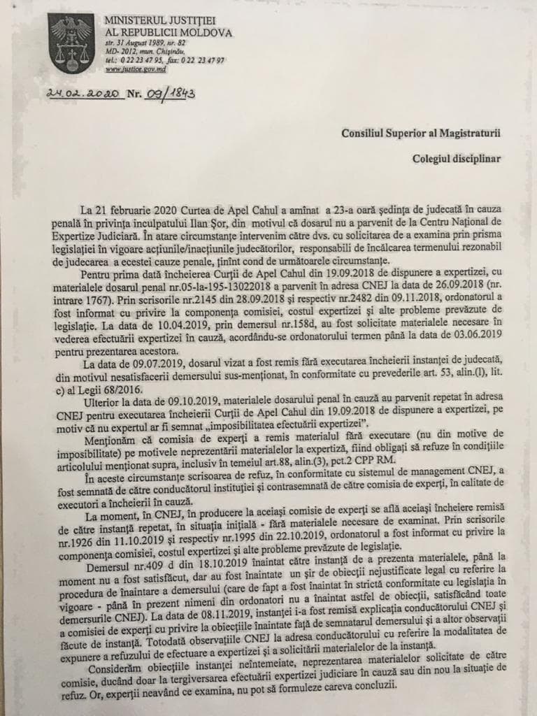 Ministerul Justiției a depus la Consiliul Superior al Magistraturii o sesizare în privința acțiunilor judecătorilor Curții de Apel Cahul care examinează dosarul deputatului fugar Ilan Șor. În document se spune că expertiza, care este așteptată de la Centrul Național de Expertize Judiciare (CNEJ) și din cauza căreia au fost amânate deja opt ședințe de judecată, întârzie pentru că instanța nu a trimis la CNEJ materialele necesare pentru comisie.