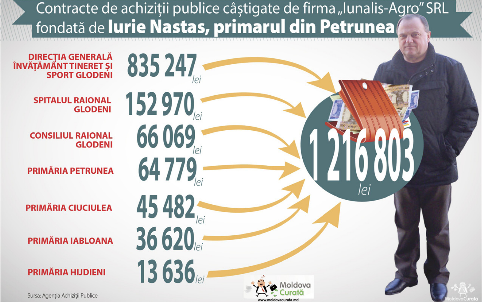 contracte de achiziţii publice în perioada anilor 2012-2016, în valoare de peste un 1 216 803 de lei. Alesul local a avut același argument: contracte sunt multe, deoarece pâinea este de calitate foarte bună. Acesta a precizat că brutăria familiei aprovizionează cu pâine și gimnaziul din Petrunea, doar că de această dată Direcția raională de învățământ a fost cea care a organizat concursurile de achiziții.