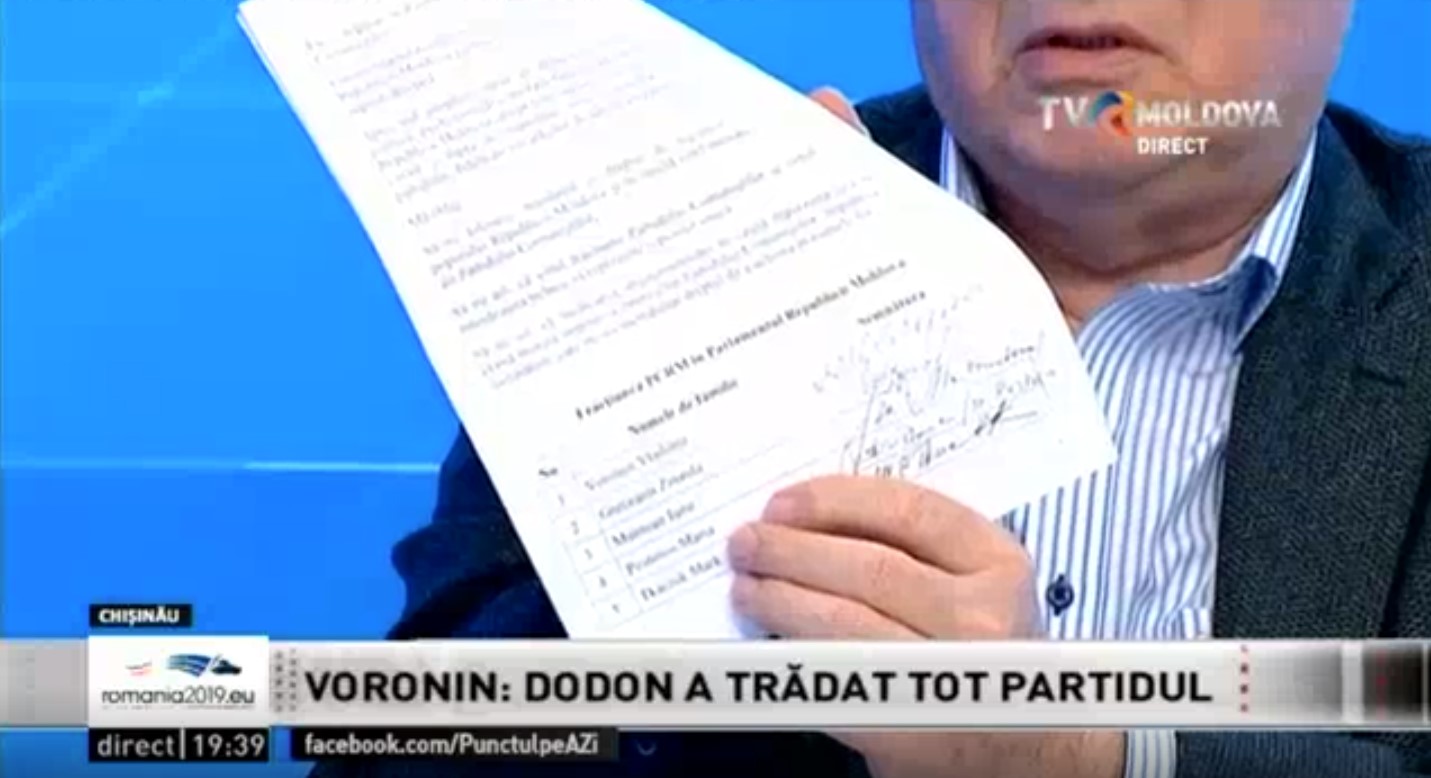 Vladimir Voronin, președintele Partidului Comuniștilor (PCRM) a făcut public, la emisiunea Punctul pe Azi de la TVR Moldova, documentul pe care l-a semnat Igor Dodon, președintele Republicii Moldova, fost membru al PCRM, prin care acesta își asuma angajamentul de a munci pentru binele poporului, alături de fracțiunea parlamentară a comuniștilor, partid pe lista cărui a ajunsese în Parlament.