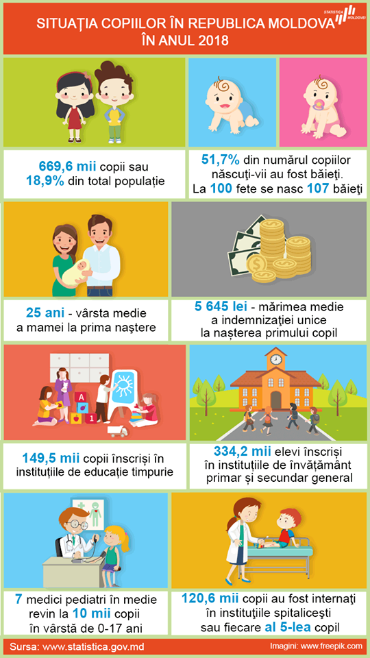 La 1 ianuarie 2019, numărul copiilor în Republica Moldova a constituit 669,6 mii copii, ceea ce înseamnă 18,9% din populație. Fiecare a cincea persoană este în vârstă de până la 18 ani, arată datele Biroului Național de Statistică.