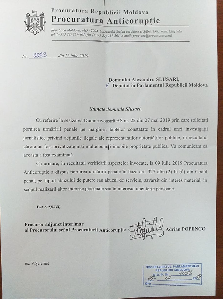Procurorul Adrian Popenco l-a informat pe deputatul Alexandru Slusari că urmărirea penală a fost pornită pentru „faptul abuzului de putere, sau abuzului de serviciu săvârșit în interes material”.
