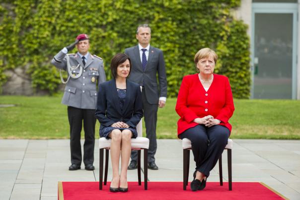 Angela Merkel s-a aşezat pe un scaun alb, alături de premierul Republicii Moldova, Maia Sandu, aflată în vizită în capitala germană, notează France Presse.