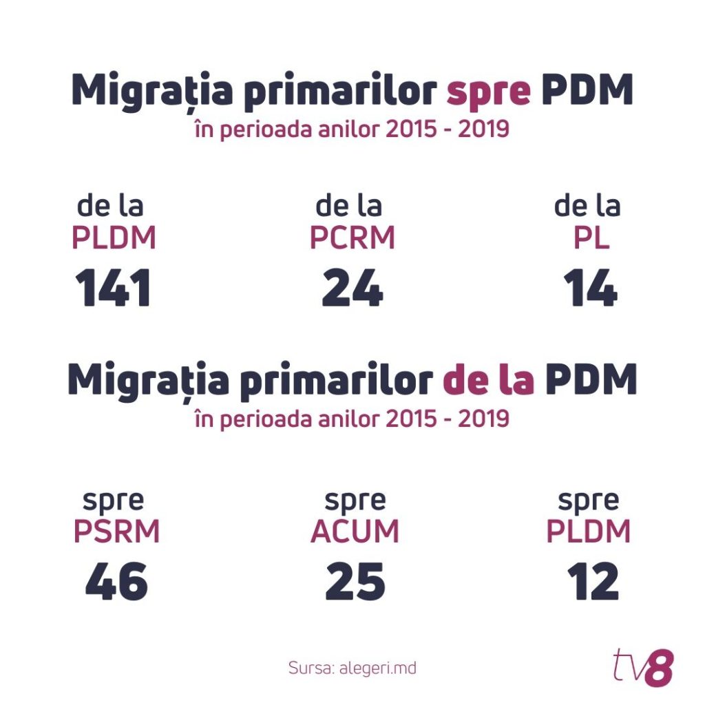 Potrivit Alegeri.md, în ultimii patru ani, 141 de primari de la Partidul Liberal Democrat au migrat la Partidul Democrat, alți 24 au venit la PD de la comuniști, iar 14, de la liberali. Ultimele date arată însă că peste 134 de primari democrați au migrat în ultima perioadă la alte partide; cei mai mulți dintre ei la Partidul Socialiștilor – 46 și la Blocul ACUM – 25.