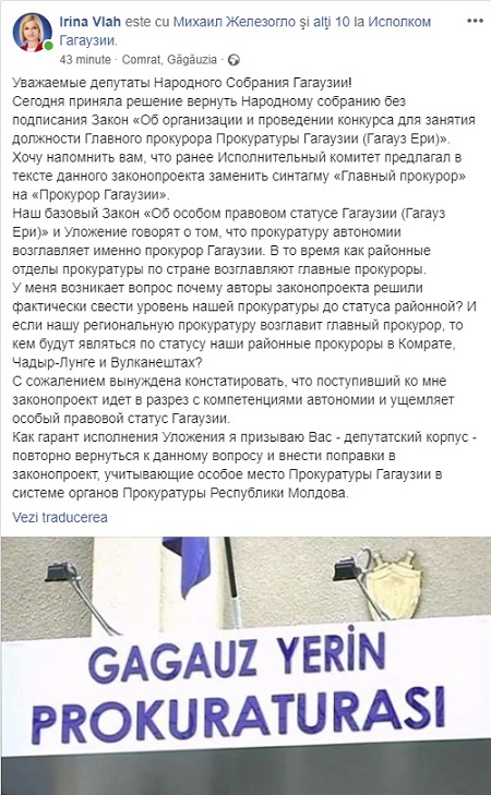 „De ce autorii proiectului au decis practic să alinieze nivelul procuraturii noastre la statutul procuraturii raionale?…Din păcate, sunt nevoită să constat că proiectul pe care l-am primit este contrar competențelor de autonomie și încalcă statutul juridic special al Găgăuziei”, a explicat Irina Vlah într-o postare pe Facebook.