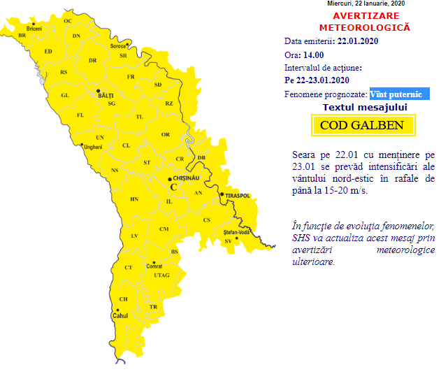 „Pe 22.01 cu menținere pe 23.01 se prevăd intensificări ale vântului nord-estic în rafale de până la 15-20 m/s.”, este mesajul meteorologilor.