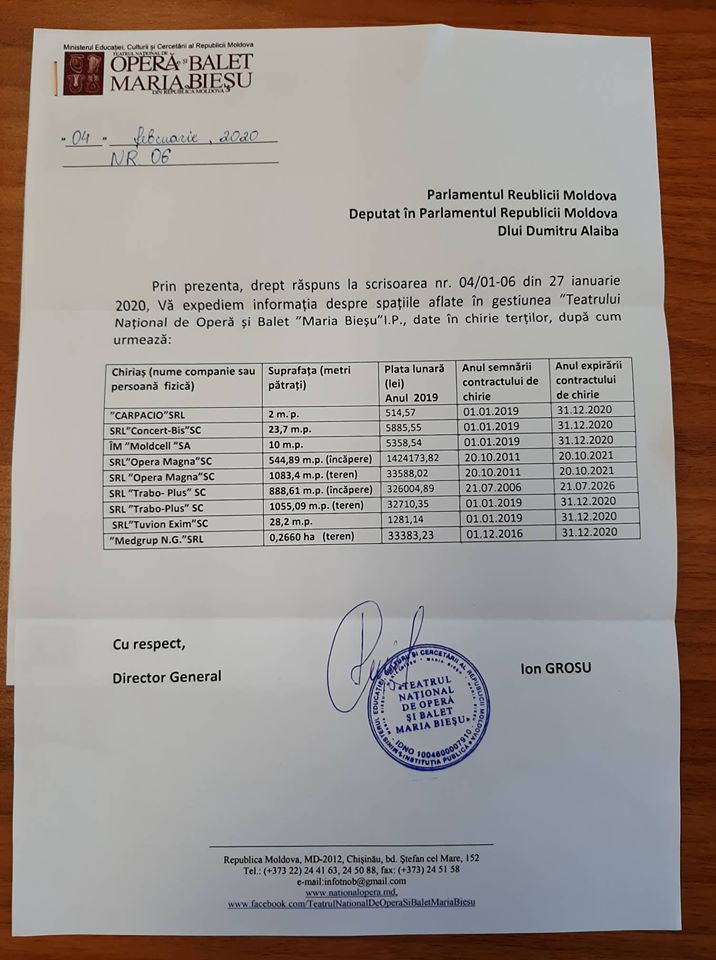 Potrivit documentului, făcut public pe Facebook, cea mai mare sumă o plătește SRL „Opera Magna”, care varsă lunar în bugetul instituției de cultură peste 1,4 milioane de lei pentru un teren și o încăpere de 544 metri pătrați pe care le-a luat în arendă.