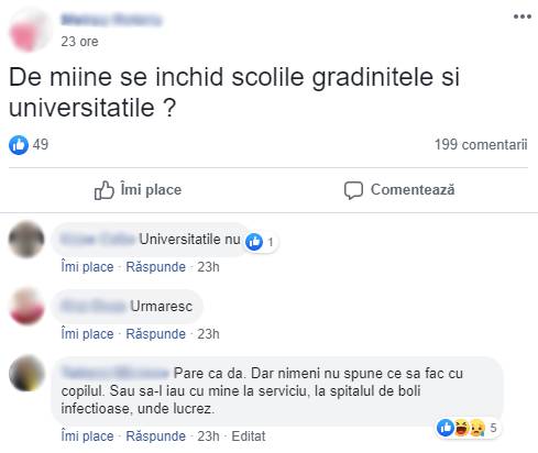 „E bine ca guvernul să faciliteze îngrijirea copiilor cu vârsta mai mică de 10-12 ani de către unul din părinți în cazurile când părinții n-au la cine apela. E bine să fie găsite soluții bugetare pentru a oferi zile libere plătite unuia din părinți. Închiderea instituțiilor de învățământ este justificată în situații de criză, dar e bine să ne gândim la securitatea copiilor rămași acasă în aceste zile”, se arată în postare.