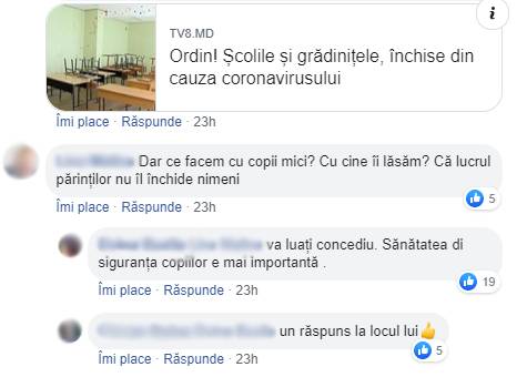 „Părinții respectivi procedează așa cum fac în cazul în care sunt vacanțele pentru copii. Asta este o situație excepțională în care miza este sănătatea copiilor. Eu aproape sunt sigur că părinții vor identifica soluții pentru a face așa încât copiii să se afle în supraveghere. Vin cu un apel către părinți să fie conștienți de ceea ce se petrece. Eu cred că nu este o problemă că copiii ar ieși la joacă la teren, în condițiile în care sunt sub supravegherea părinților. Să fie atenți cu cine contactează și starea micuților”, a spus ministrul pentru tv8.md.