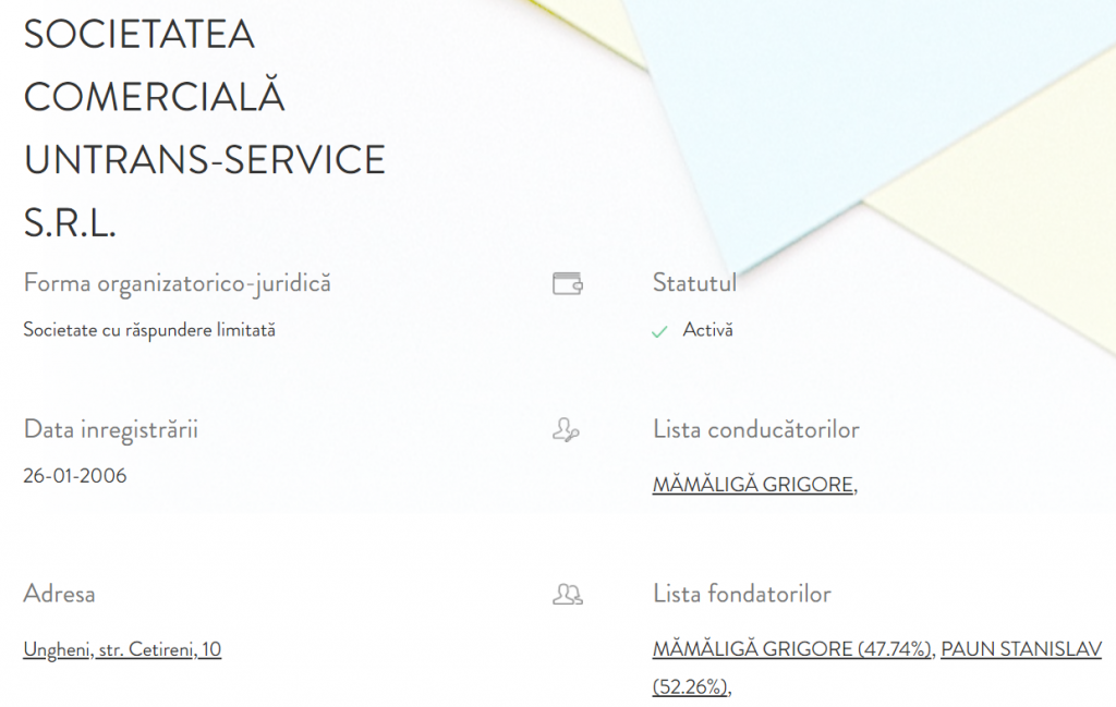 Una dintre firme este „Untrans Service”, cu sediul în orașul Ungheni, fondată în 2006 de Stanislav Păun și Grigore Mămăligă, care este și conducătorul companiei de transport. Potrivit surselor noastre, Grigore Mămăligă ar fi rudă cu șeful Serviciul protecție internă și anticorupție al Ministerului de Interne, Ion Mămăligă, numit în funcție în februarie curent. Acesta este originar din Ungheni, potrivit CV-ului.