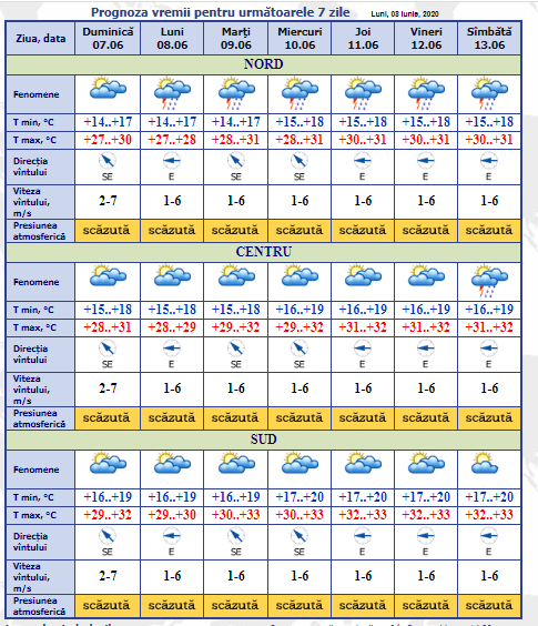 Pentru următoarele zile vremea se va încălzi ușor. Astfel, marți, miercuri și joi vom avea temperaturi cu cel puțin un grad mai mult, maxima ajungând la 33 de grade în sudul țării. Noaptea mercurul în termometre va oscila între +14 la Nord și +20 la Sud. În Nordul țării, de luni până sâmbătă, meteorologii promit ploi.