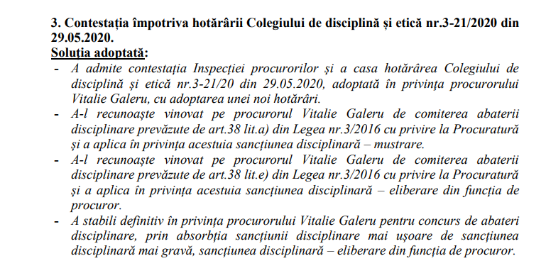 CSP a admis contestația Inspecției procurorilor și a casat hotărârea Colegiului de disciplină și etică adoptată în privinţa procurorului Vitalie Galeru, cu adoptarea unei noi hotărâri. Galeru a fost recunoscut vinovat de comiterea abaterii disciplinare prevăzute de art.38 lit.a) din Legea cu privire la Procuratură și a aplica în privința acestuia sancțiunea disciplinară – mustrare.