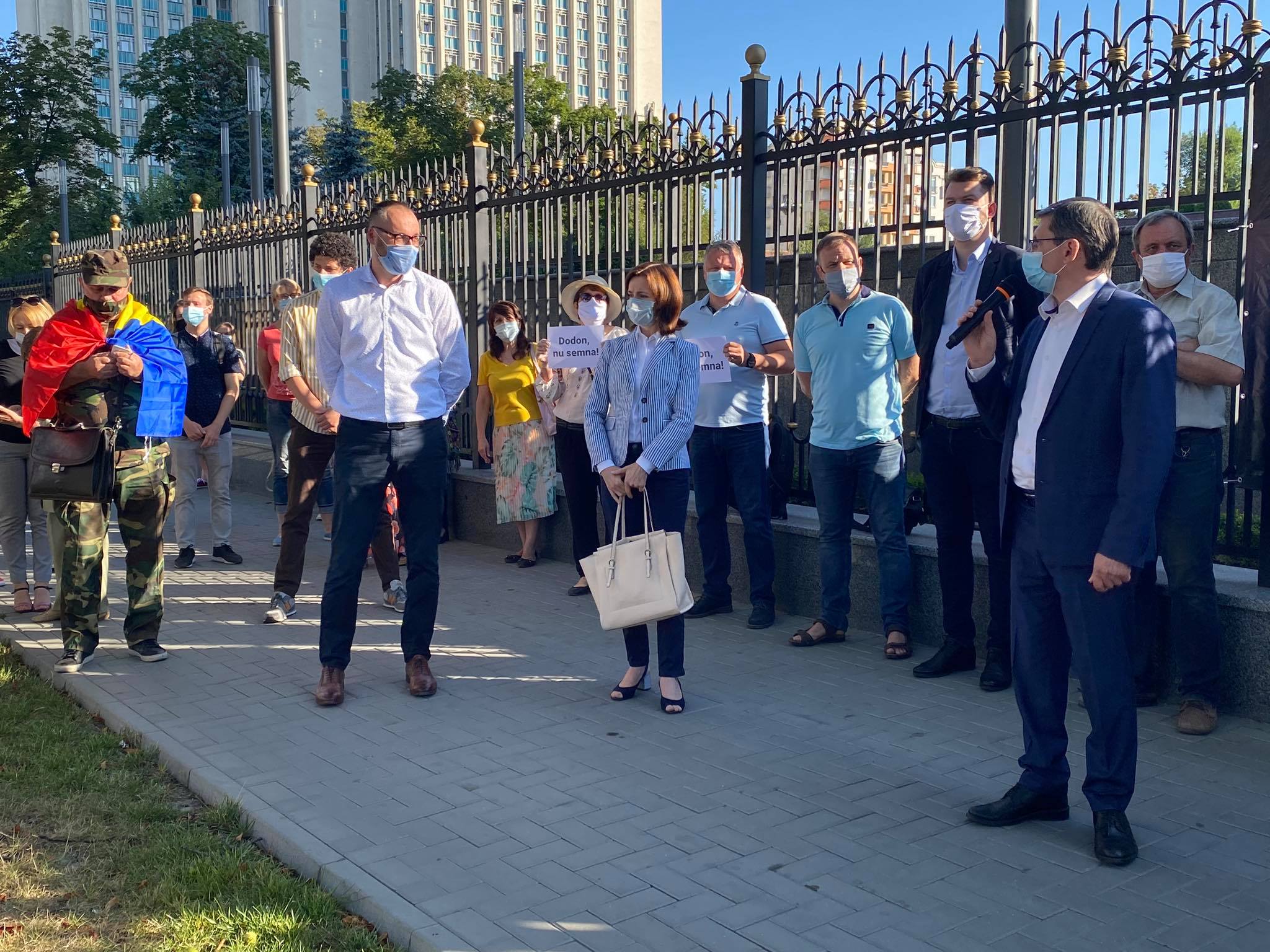 Protestul în fața Președinției a început la ora 8. Cei de la PAS spun că ultimele hotărâri ale Consiliului Superior al Magistraturii, i-a scos la manifestație. Mai exact, este vorba de avansarea în funcție a unor judecători dubioși, în urma cărora Moldova a fost condamnată de CtEDO și obligată să plătească despăgubiri de milioane. Pe gardul Președinției a fost instalată o pancartă pe care este inscripționat: „Dodon, nu semna pentru judecători corupți. E vremea oamenilor buni”.