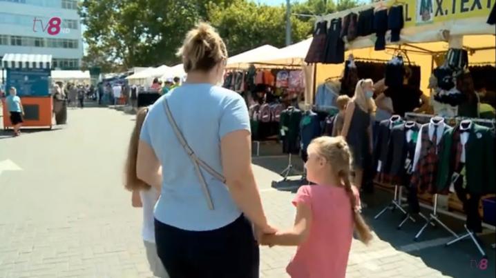 Cu cele două fiice de mână, femeia din imagini a venit la târg în căutarea rechizitelor și a vestimentației pentru școală.