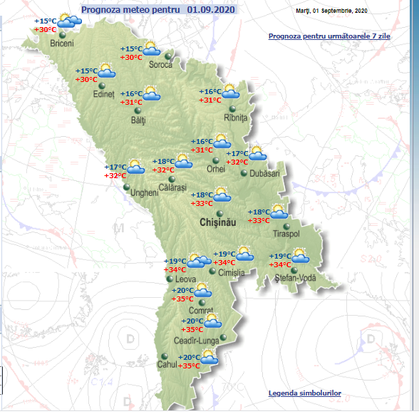 Astăzi, 1 septembrie, maximele temperaturii aerului pe teritoriul Republicii Moldova vor fi de +35 grade Celsius. Valorile pozitive se vor înregistra în sudul țării. Sinopticienii promit pentru astăzi cer variabil.