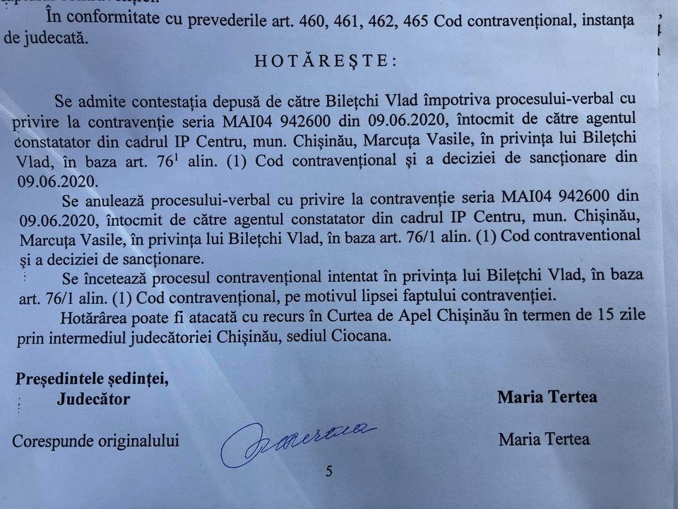 Procesul verbal prin care a fost amendat cu peste 22 de mii de lei în privința unionistului Vlad Bilețchi a fost anulat. Ieri, instanța de judecată a anulat procesul verbal pentru că lipsește fapta contravenției. Unionistul a fost amendat în luna mai pentru faptul că a întâmpinat, împreună cu alți unioniști, ajutorul umanitar venit din partea României.