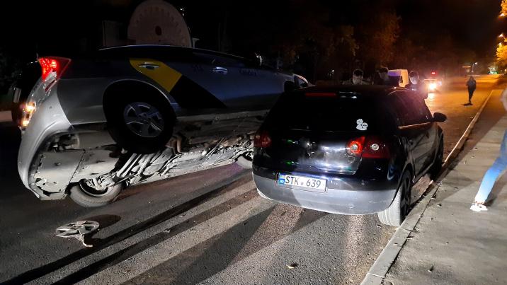 Un accident mai puțin obișnuit s-a produs cu puțin timp în urmă în capitală. Un taxi a ajuns peste un automobil care staționa pe marginea unei străzi.