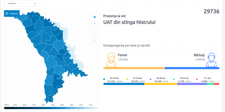 În priumul tur de scritin, în secțiile de votare deschise pentru alegătorii din stânga Nistrului s-a înregistrat, până la ora 18.00, o prezență de circa 14 mii de persoane.