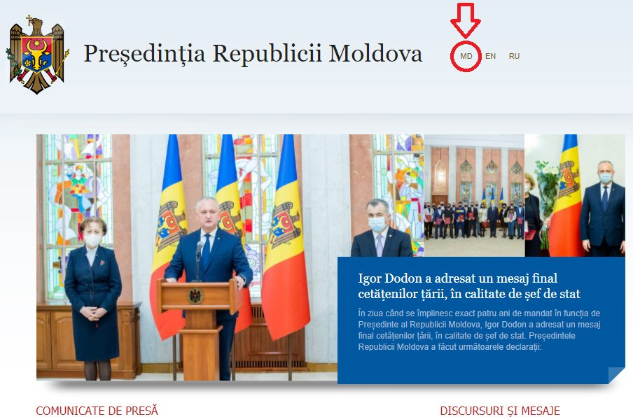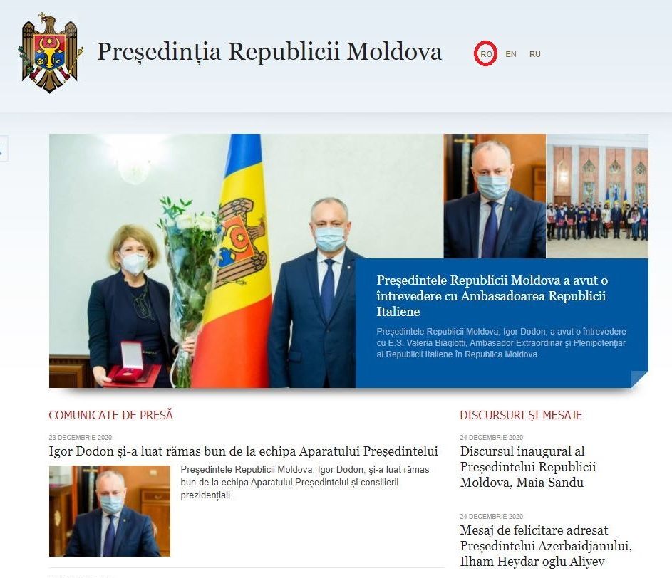 Pe site-ul Președinției a fost schimbat simbolul care afișează limba în care este prezentată pagina online a instituției. Astfel, limba moldovenească a fost înlocuită cu limba română, iar insigna MD a fost schimbată cu RO.