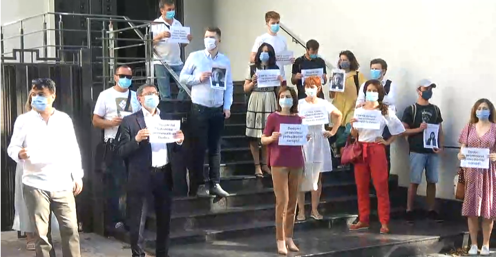 Participanții s-au aliniat pe scările instituției și țin în mână foi cu diverse inscripții.