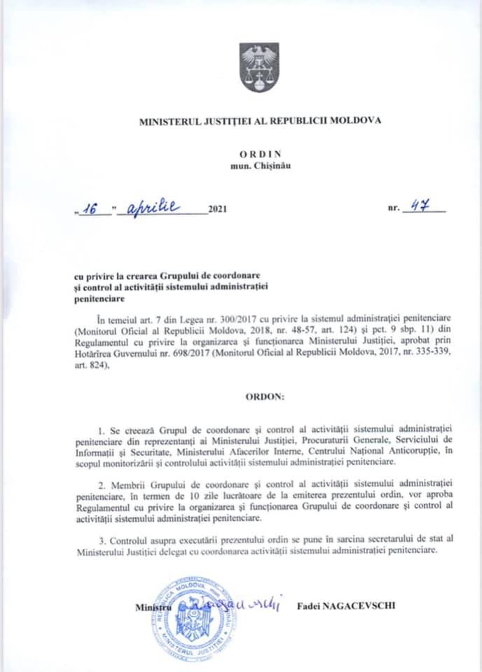 În document se mai menționează că controlul asupra executării prezentului ordin se pune în sarcina secretarului de stat al Ministerului Justiției delegat cu coordonarea activității sistemului administrației penitenciare.