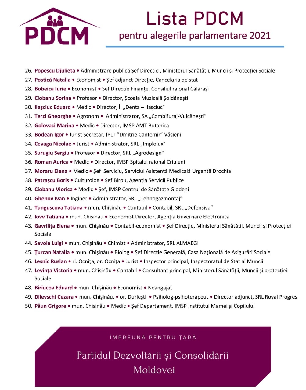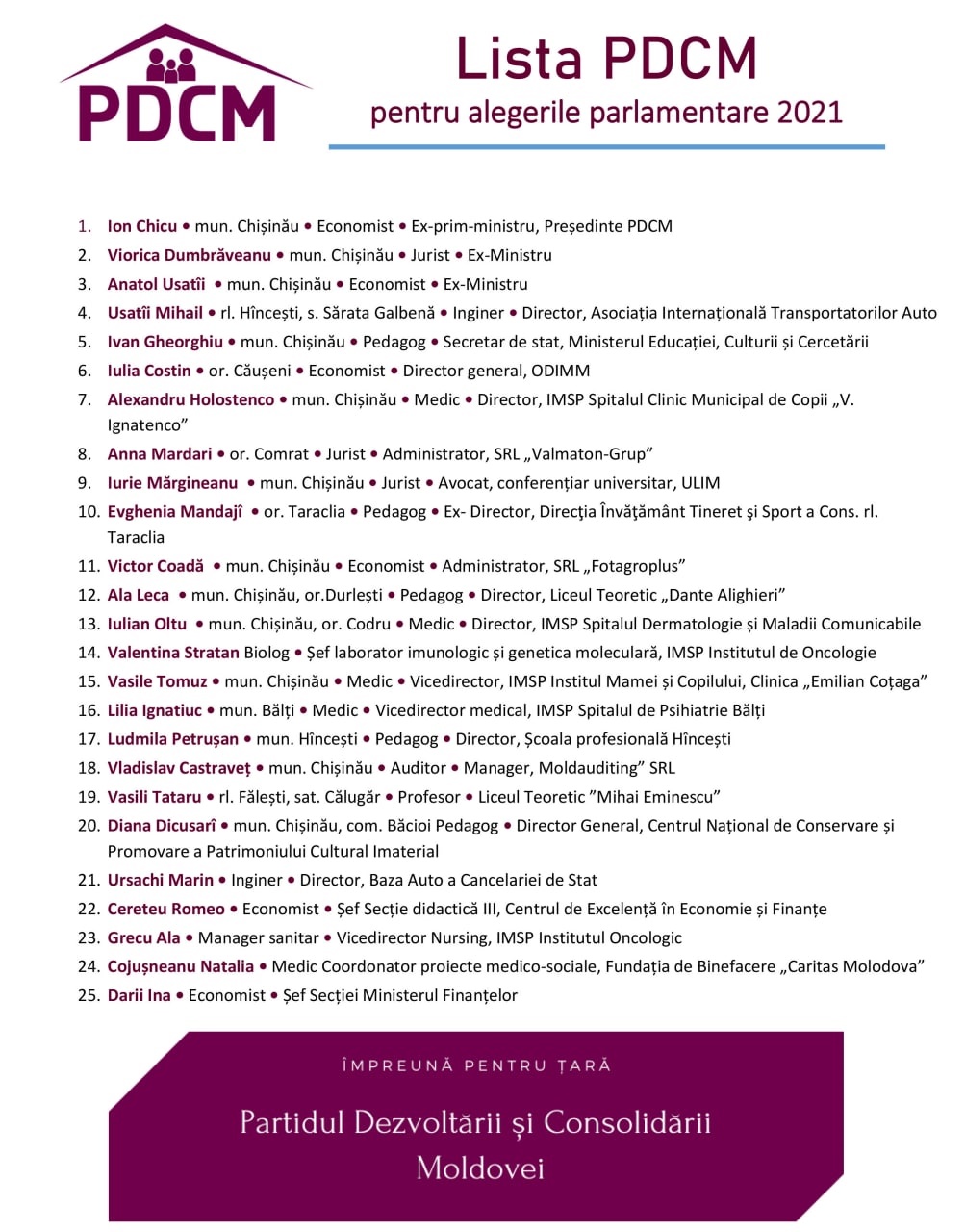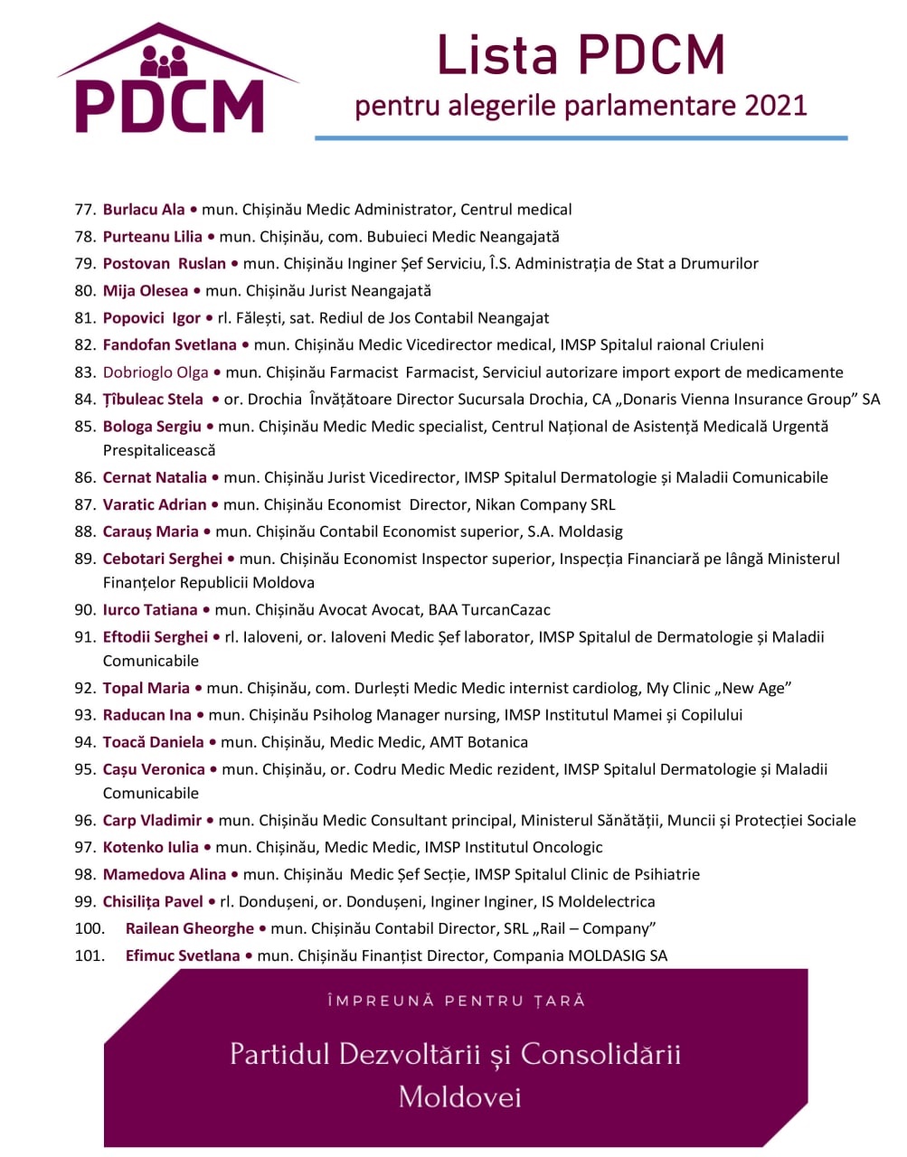 Potrivit informațiilor, lista Partidul Dezvoltării și Consolidării Moldovei este formată din 101 persoane.