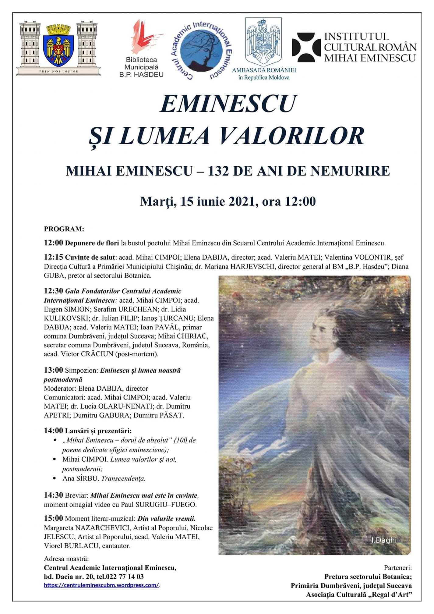 La ora 12:00, la bustul poetului Mihai Eminescu din Grădina Publică “Ştefan cel Mare şi Sfânt” vor avea loc depuneri de flori și recitaluri de poezie. La eveniment vor participa membri ai Uniunii Scriitorilor, oameni de cultură, ziarişti, dar şi simpli admiratori ai operei eminesciene.