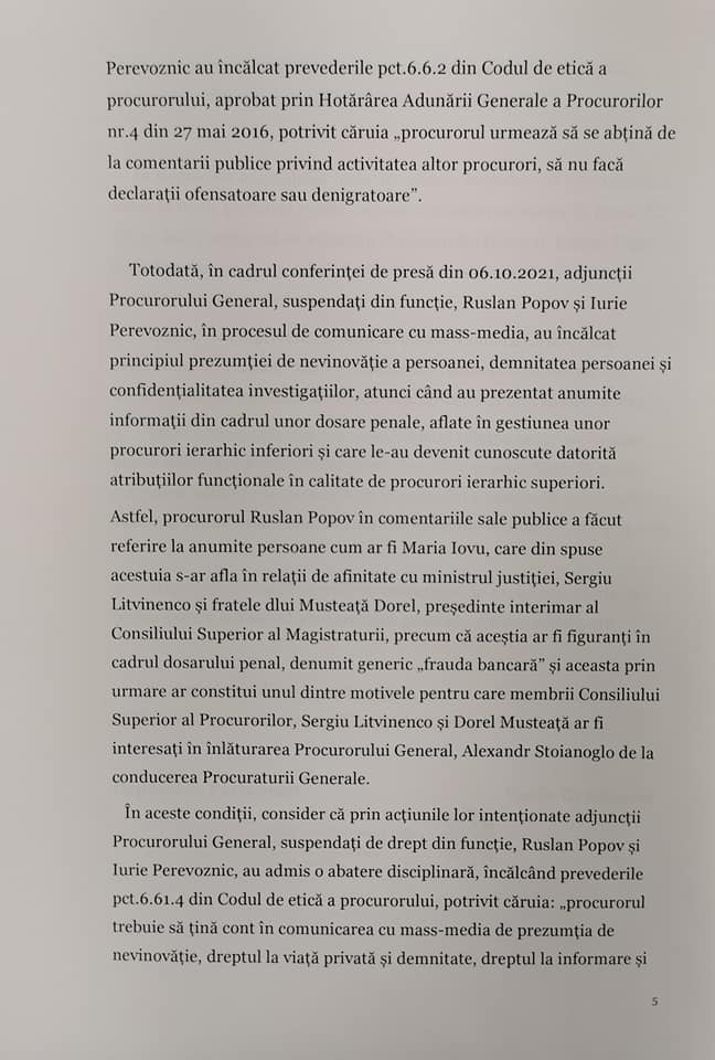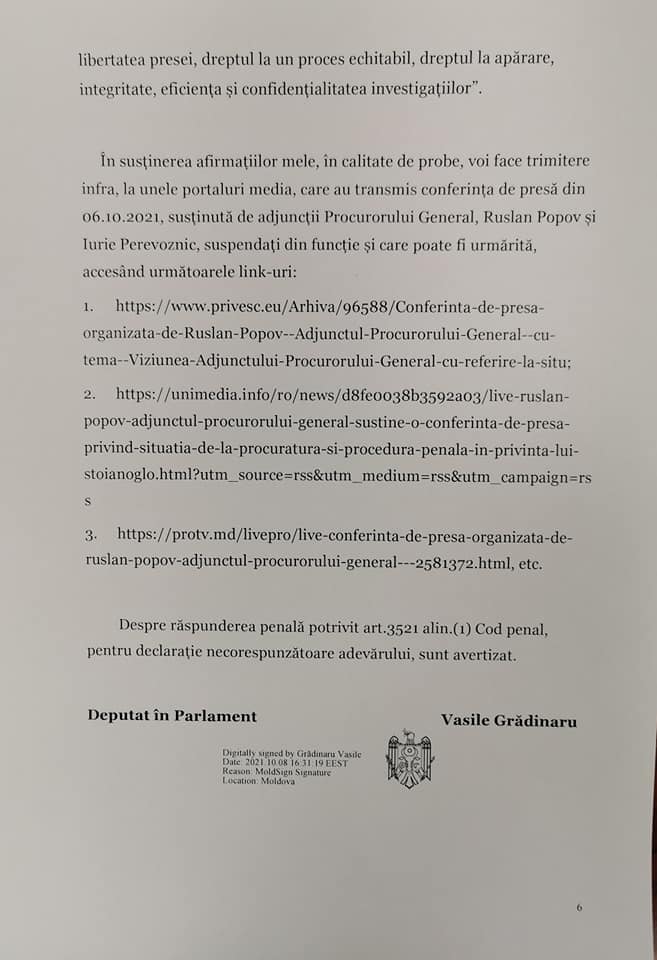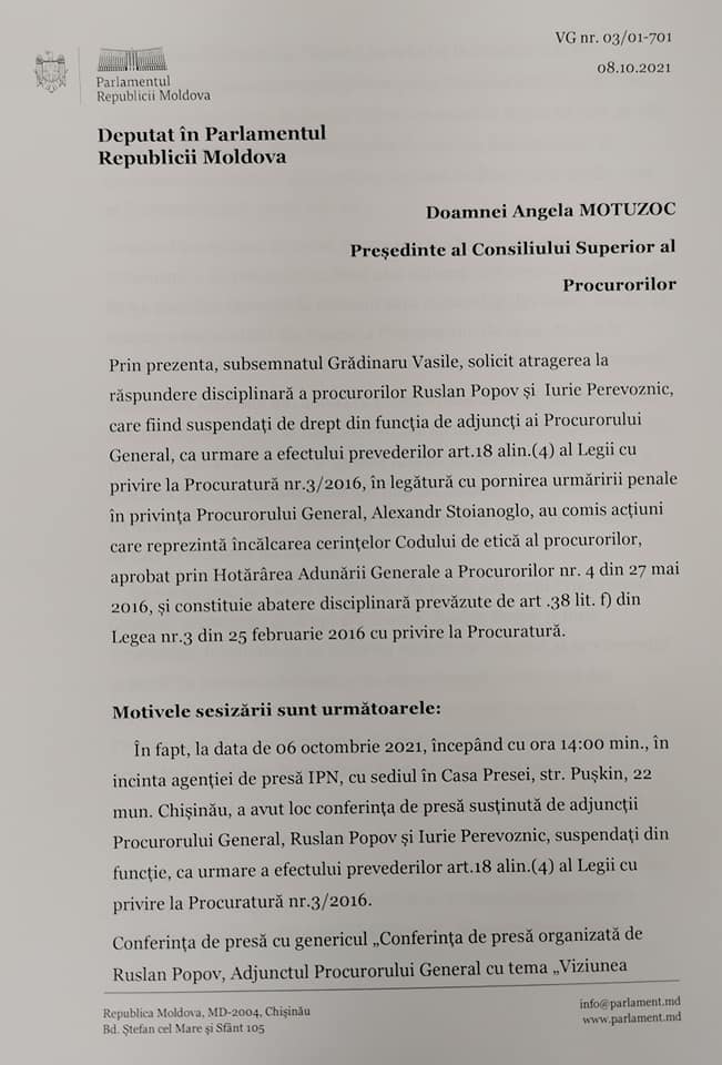 Deputatul Partidului Acțiune și Solidaritate (PAS), Vasile Grădinaru a depus astăzi, 8 octombrie, o sesizare la Consiliul Superior al Procurorilor (CSP) pe numele procurorilor Ruslan Popov și Iurie Perevoznic, în legătură cu conferința de presă pe care aceștia au organizat-o după arestarea șefului suspendat al Procuraturii Generale (PG), Alexandru Stoianoglo. Grădinaru menționează că cei doi au încălcat cerințele Codului de etică al procurorilor.