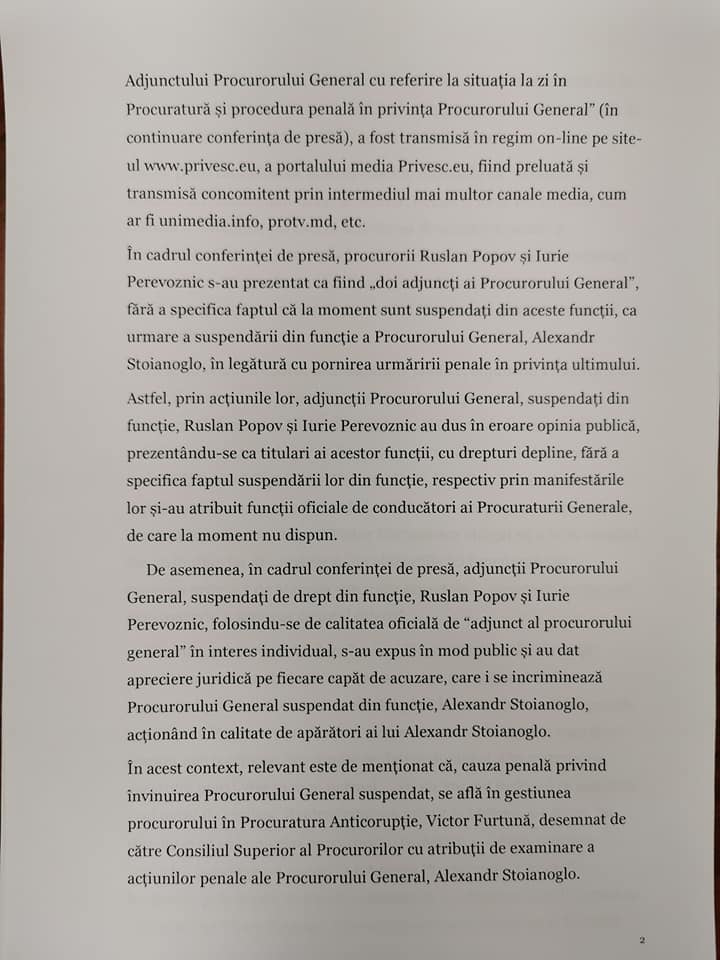 „Ei organizează conferință de presă în cadrul căreia, în interes individual, s-au expus în mod public și au dat apreciere juridică pe fiecare capăt de acuzare, care i se incriminează procurorului general suspendat din funcție, Alexandru Stoianoglo, acționând în calitate de apărători ai lui”, a scris Grădinaru pe Facebook.
