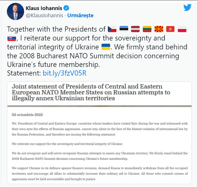 „Noi, preşedinţi ai unor state din Europa Centrală şi de Est, ţări ai căror lideri au vizitat Kievul în timpul războiului şi au văzut cu ochii lor efectele agresiunii ruse, nu putem rămâne tăcuţi în faţa încălcării flagrante a dreptului internaţional de către Federaţia Rusă, motiv pentru care transmitem următoarea declaraţie: reiterăm susţinerea noastră pentru suveranitatea şi integritatea teritorială a Ucrainei. Nu recunoaștem și nu vom recunoaște niciodată încercările Rusiei de a anexa vreun teritoriu ucrainean”, se precizează în declarația comună.