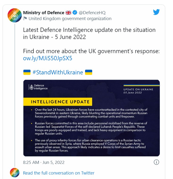 Serviciile secrete militare ale Marii Britanii au mai spus că în ultimele 24 de ore, forţele ucrainene au contraatacat în disputatul oraş Severodoneţk din estul Ucrainei şi cel mai probabil au redus elanul operaţional pe care forţele ruseşti îl obţinuseră anterior prin concentrarea unităţilor de luptă şi a puterii de foc.