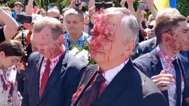 Ambasadorul Federației Ruse în Polonia a fost stropit cu vopsea roșie în timp ce mergea să depună flori la monumentele sovietice, de 9 mai. RIA a publicat un filmuleț în care se observă cum ambasadorul Serghei Andreev, dar și persoanele din apropierea sa sunt stropiți cu vopsea.