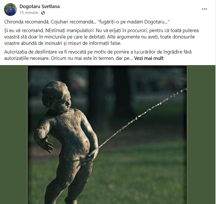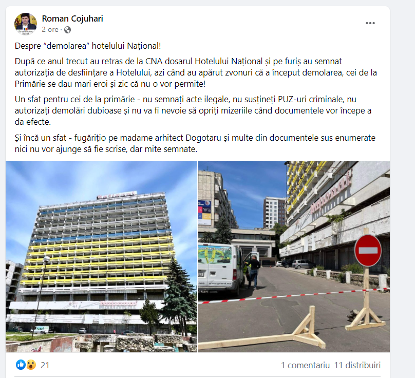 „Un sfat pentru cei de la Primărie: nu semnați acte ilegale, nu susțineți PUZ-uri criminale, nu autorizați demolări dubioase și nu va fi nevoie să opriți mizeriile când documentele vor începe a da efecte. Și încă un sfat- fugăriți-o pe madame arhitect Dogotaru și multe din documentele sus enumerate nici nu vor ajunge să fie scrise, darăminte semnate”, scrie acest pe pagina sa de Facebook.