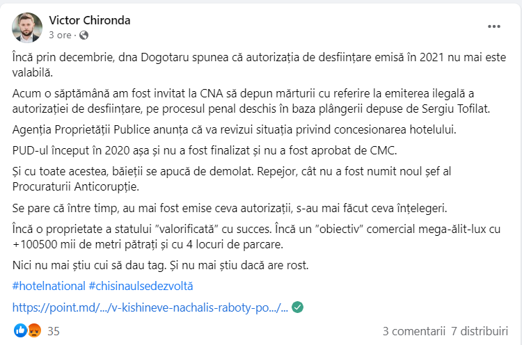Posibila demolare a clădirii Hotelului Național din centrul Capitalei a stârnit nu doar un val de critici, dar și unul de acuzații între Chironda, Cojuhari și Dogotaru. După ce în spațiul public au apărut imagini cum teritoriul clădirii este îngrădit pentru a fi interzisă circulația, fostul viceprimar al Capitalei, Victor Chironda, a venit cu o reacție pe pagina sa de Facebook în care susține că demolarea clădirii s-a început repejor „cât nu a fost numit un nou șef la Procuratura Anticorupție”.