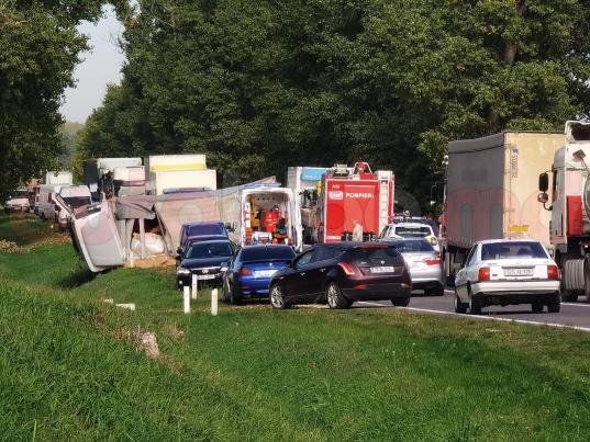 Camionul Mercedes ATEGO s-a răsturnat, iar automobilul Toyota a fost proiectat pe banda inițială cu direcția spre acostament.