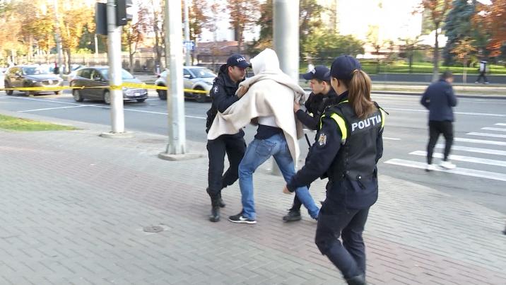 Doar după ce au intervenit mai mulți polițiști, protestarul a fost imobilizat și dus la Inspectorat.