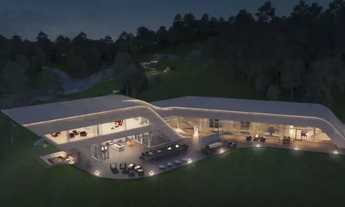De fapt, au existat două case: una cu un acoperiș acoperit de iarbă și un heliport. Dar, în rest, complexul părea relativ modest, cu Cabana Pescarului din lemn și sticlă futuristă, mobilată în interior cu canapele crem în stil Ikea. Acoperișul de iarbă al clădirii ar viza evitarea identificării clădirii din spațiu.