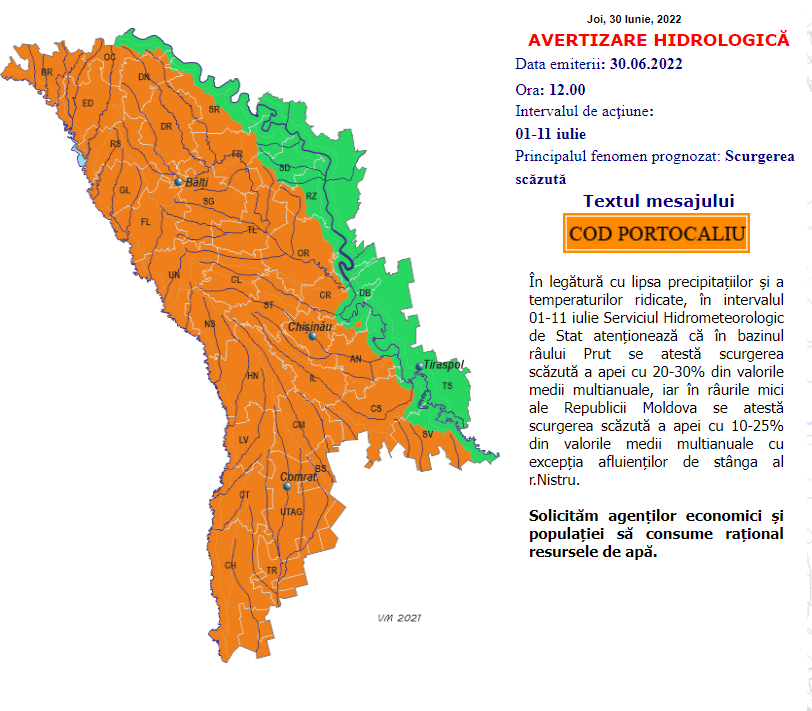 Specialiștii Serviciului Hidrometeorologic de Stat (SHS) au emis o alertă de cod portocaliu de scurgere scăzută a apei cu 20-30% în râul Prut. În râurile mici ale Republicii Moldova se atestă scurgerea scăzută a apei cu 10-25% din valorile medii multianuale cu excepția afluenților de stânga ai râului Nistru.