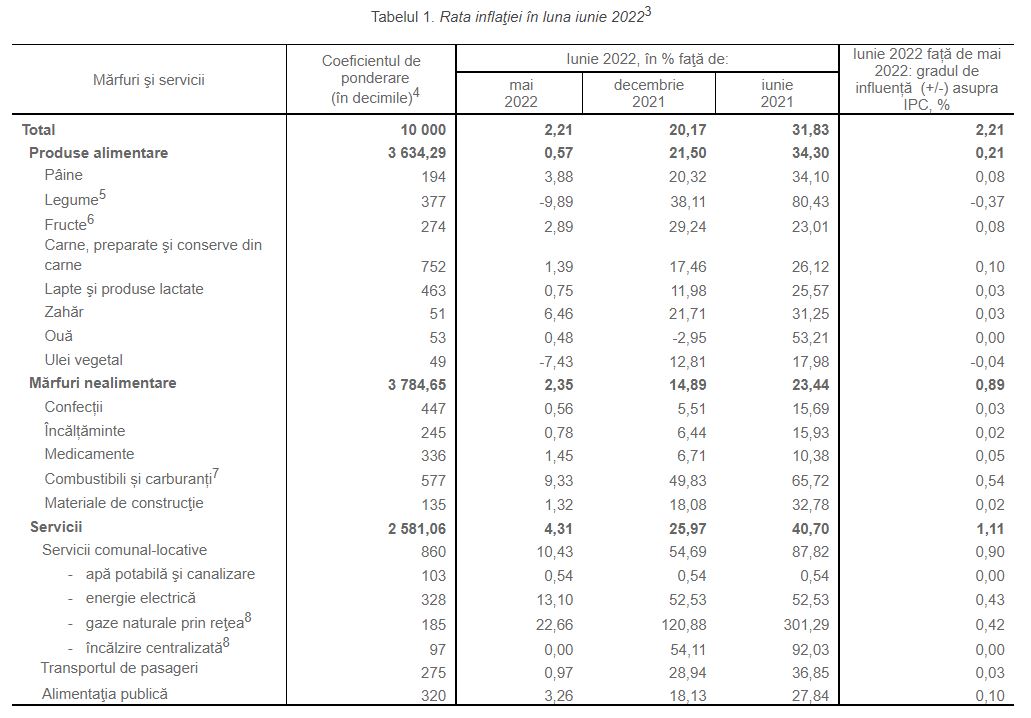 Creșteri mai accentuate a prețurilor la serviciile prestate populației în luna iunie 2022 au fost înregistrate la gazele naturale - cu 22,7% și la furnizarea energiei electrice - cu 13,1%, generând împreună creșterea prețurilor medii de consum cu peste 0,8%.