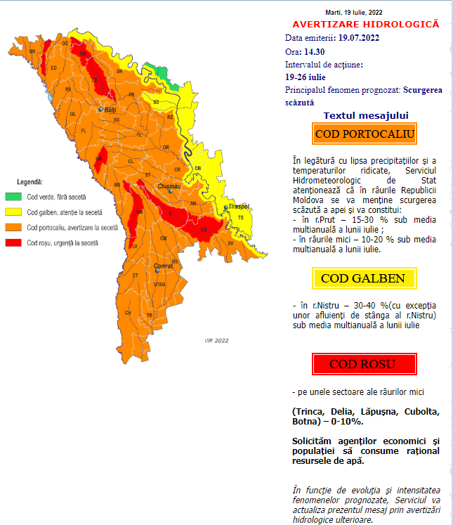 Potrivit avertizării hidrologice, scurgerea va constitui: în râul Nistru – 30-40 % sub media multianuală a lunii iulie; în Prut – 15-30 % sub media multianuală a lui iulie; în râurile mici – 10-20 % sub media multianuală a lunii iulie, iar pe unele sectoare ale râurilor mici – 0-10%.