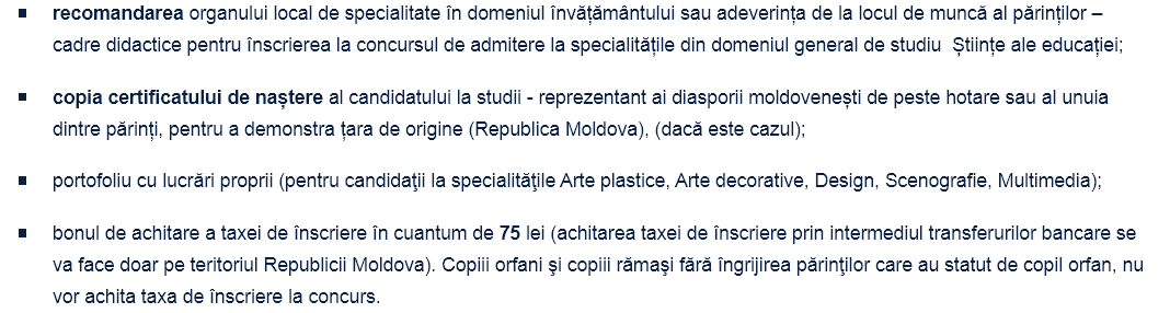 - recomandarea organului local de specialitate în domeniul învățământului sau adeverința de la locul de muncă al părinților – cadre didactice pentru înscrierea la concursul de admitere la specialitățile din domeniul general de studiu Ştiinţe ale educaţiei;