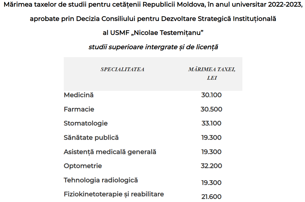 ATENȚIE: în conformitate cu Ordinul MSMPS al RM și MECC al RM nr. 851/905 din 17 iulie 2019, certificatul medical-tip (nr. 086/e) a fost exclus din lista actelor necesare pentru înscrierea la concursul de admitere în instituțiile de învățământ superior.