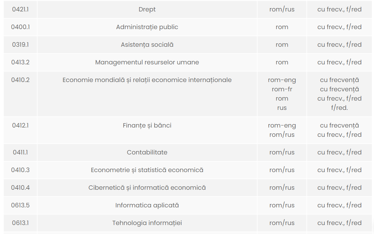 + La învățământul cu frecvență redusă studiile se efectuează numai cu achitarea taxei de studii la toate domeniile de formare profesională, programe de studii.