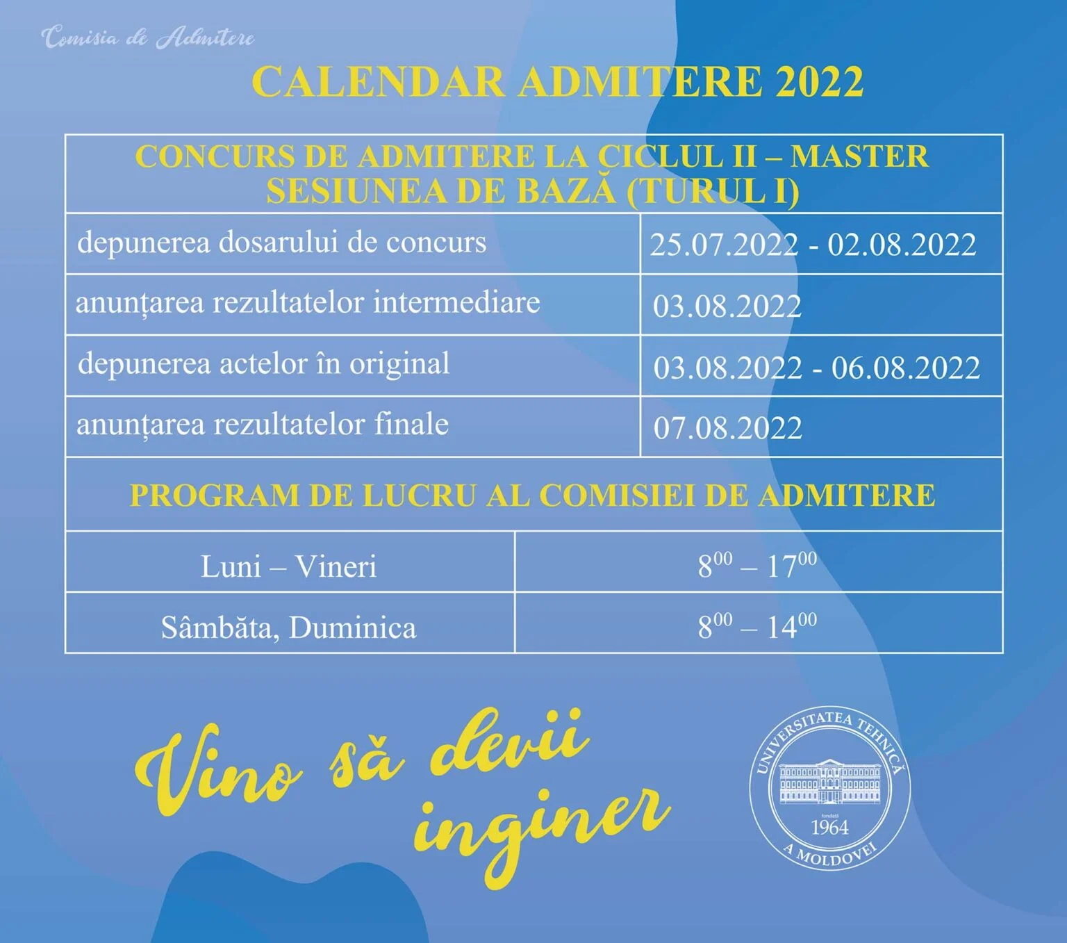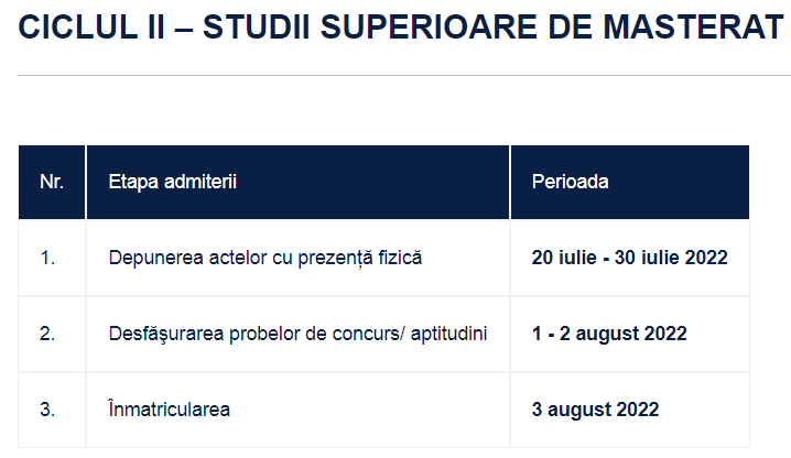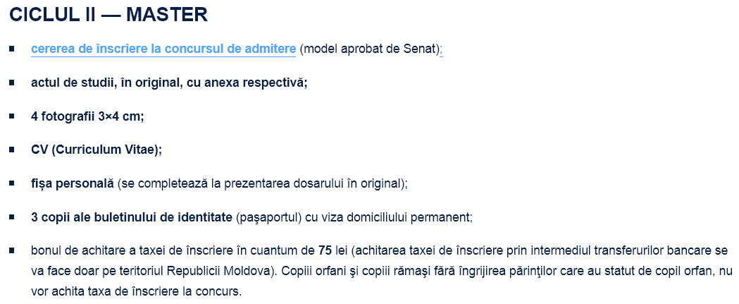Pentru înscrierea la concursul de admitere în învățământul superior de master (ciclul II) sunt necesare următoarele acte: