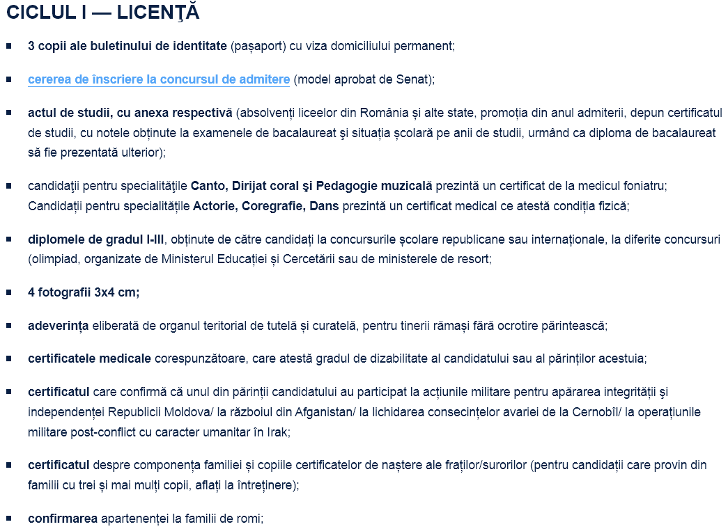 Dosarul candidatului la admitere va cuprinde următoarele documente: