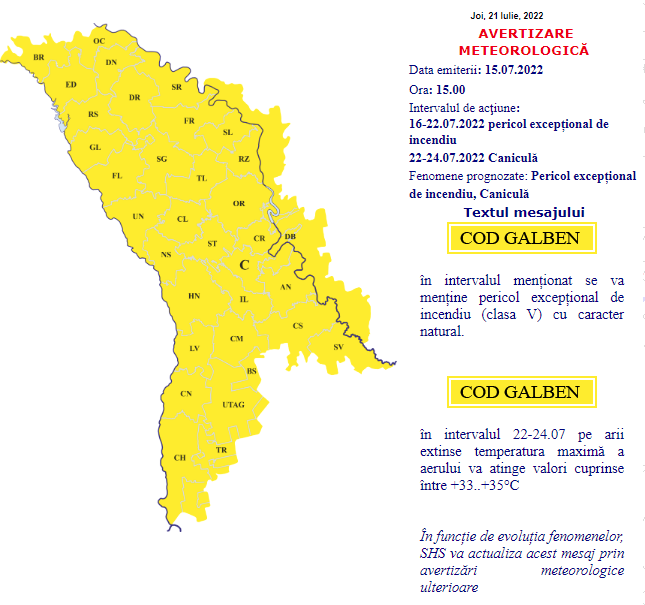 Specialiștii Serviciului Hidrometeorologic de Stat (SHS) au emis o alertă de cod galben de caniculă  pe întreg teritoriul Republicii Moldova. Codul intră în vigoare de vineri, 22 iulie, până duminică, 24 iulie. Astfel, în perioada dată, temperatura maximă a aerului va atinge valori cuprinse între +33...+35°C.