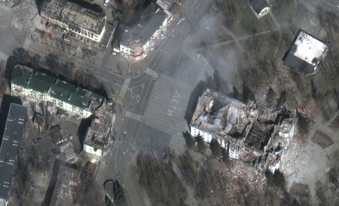 Zona aflată la est de teatrul bombardat de ruși, unde autoritățile cred că aproximativ 300 de persoane au murit, este în ruine. Într-o imagine din satelit se vede că acoperișurile fie lipsesc, fie au fost deteriorate pe aproape fiecare clădire.