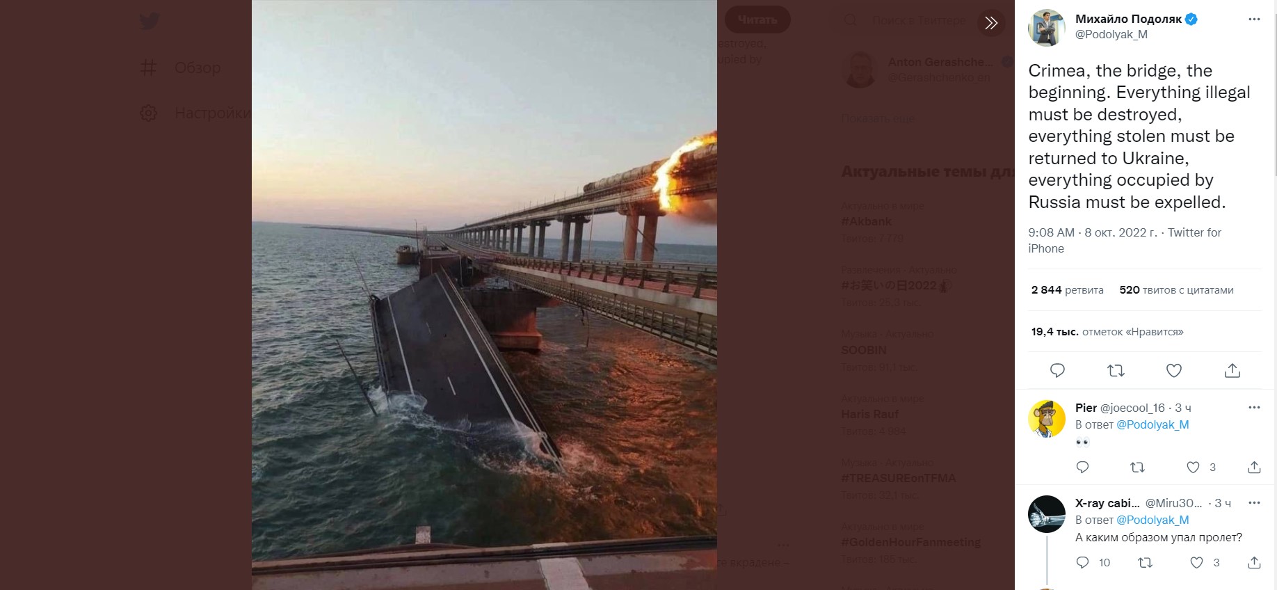 Consilierul lui Zelenski nu spune direct dacă lovitura asupra podului a fost efectuată de ucraineni, dar susține că tot ce aparține Rusiei trebuie distrus.