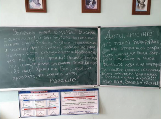 „Copii, ne pare rău pentru asemenea mizerie, am încercat să salvăm școala, dar au fost bombardamente. Trăiți în pace, aveți grijă de voi și nu repetați greșelile făcute de bătrânii voștri. Ucraina și Rusia sunt un singur popor!!! Pacea fie cu voi, fraților și surorilor!”, au scris soldații ruși, pe tablă. La final, ei s-au semnat ”Rușii”.