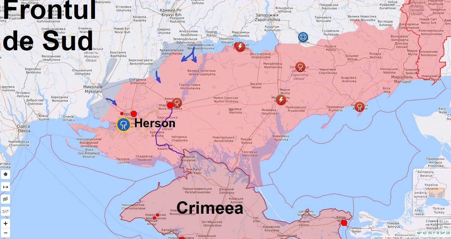 UPDATE Anterior au fost raportate lungi coloane și trenuri cu blindate care se mișcă dinspre Crimeea și dinspre Mariupol spre Herson. Locuitorii din Novooleksiivka (chiar la nord de granița dintre Crimeea și regiunea Herson) au raportat explozii în apropierea unui nod feroviar imediat după sosirea unui tren rusesc din Crimeea. Activitatea de sabotaj a partizanilor (sau a forțelor speciale) este puternică în zonă și coordonată cu armata și artileria ucraineană.