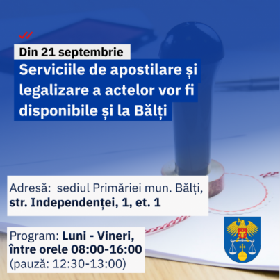 Ministerul Justiției a deschis un nou ghișeu al Direcției apostilă și legalizare, în municipiul Bălți. Astfel, cetățenii vor avea posibilitatea să depună documentele spre apostilare și legalizare la ghișeul din Bălți și să le ridice, la data indicată, tot de acolo. serviciul va fi disponibil, începând cu data de 21 septembrie.